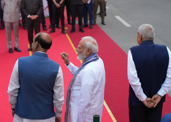 New Delhi: Vice President Jagdeep Dhankhar with Prime Minister Narendra Modi and Lok Sabha Speaker Om Birla during a ceremony to pay tribute to BR Ambedkar on his birth anniversary, in New Delhi, Monday, April 14, 2025. (PTI Photo/Arun Sharma)(PTI04_14_2025_000035B)