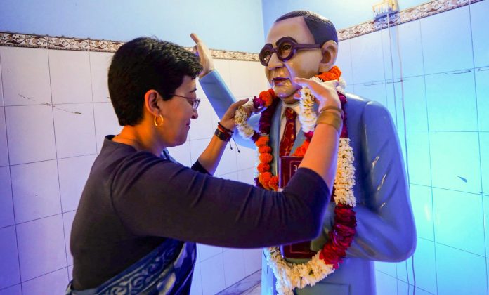 **EDS: THIRD PARTY IMAGE** In this image released by @AtishiAAP via X on Monday, April 14, 2025, AAP leader Atishi pays tribute to BR Ambedkar on his birth anniversary, in New Delhi. (@AtishiAAP on X via PTI Photo)(PTI04_14_2025_000052B)
