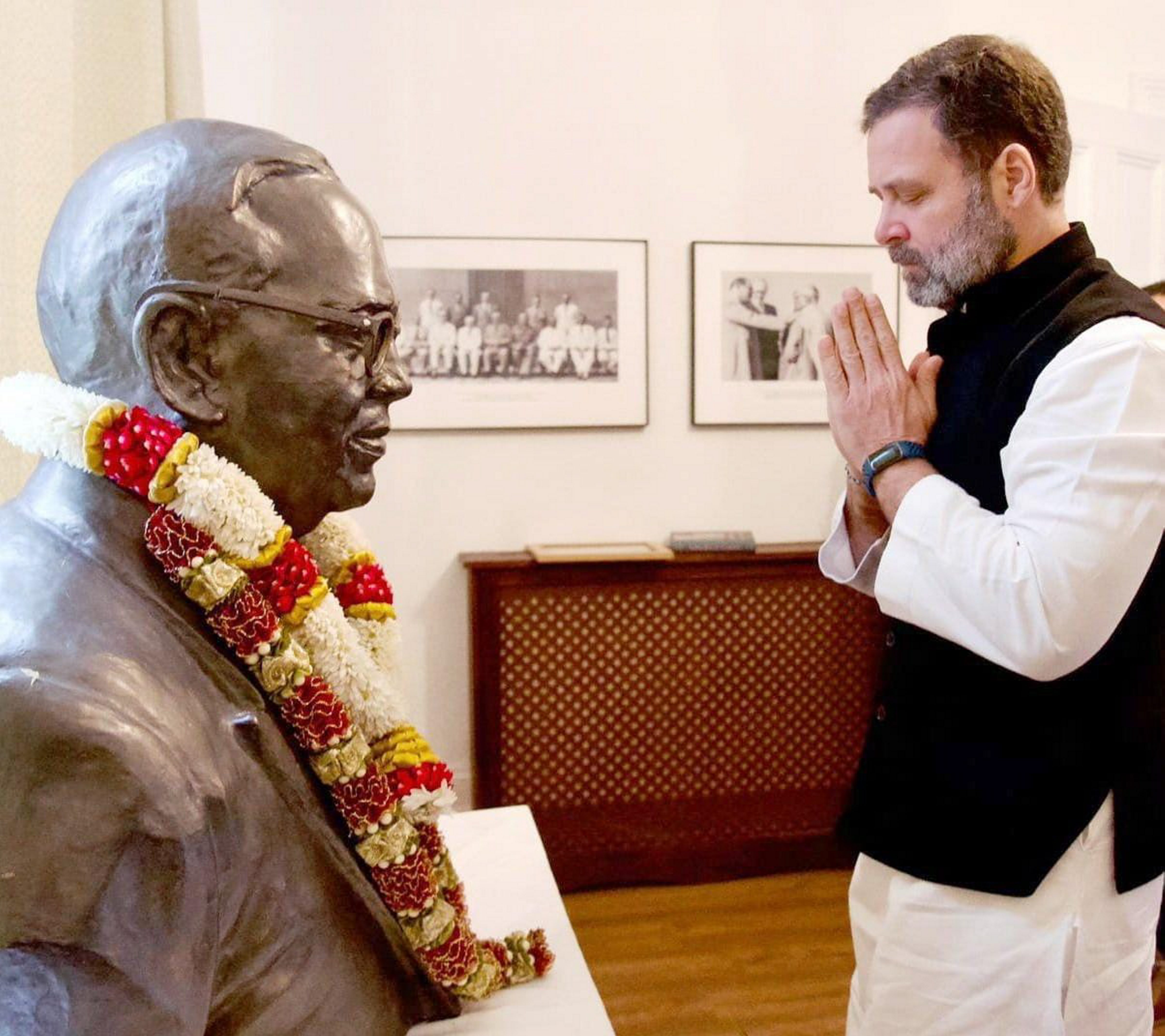**EDS: THIRD PARTY IMAGE** In this image released by @RahulGandhi via X on Monday, April 14, 2025, LoP in the Lok Sabha and Congress leader Rahul Gandhi pays tribute to BR Ambedkar on his birth anniversary, in New Delhi. (@RahulGandhi on X via PTI Photo)(PTI04_14_2025_000051B)