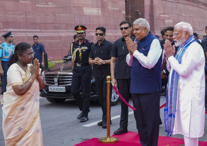 **EDS: THIRD PARTY IMAGE** In this image released by @VPIndia via X on Monday, April 14, 2025, President Droupadi Murmu being greeted by Vice President Jagdeep Dhankhar and Prime Minister Narendra Modi during a ceremony to pay tribute to BR Ambedkar on his birth anniversary, in New Delhi. (@VPIndia on X via PTI Photo)(PTI04_14_2025_000071B)