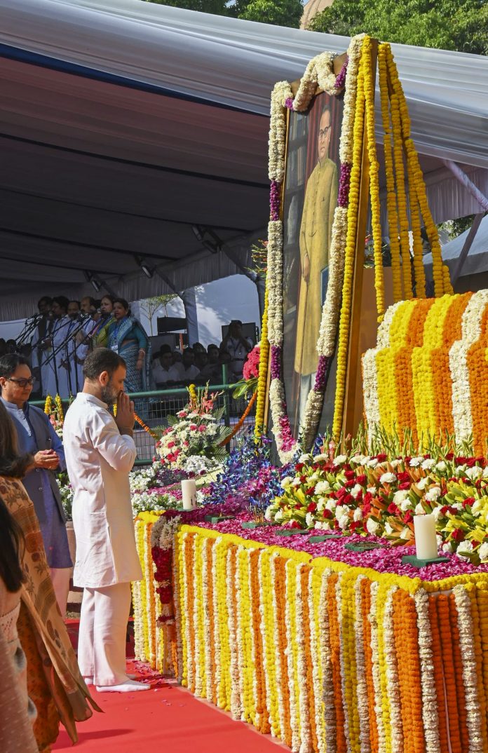 **EDS: THIRD PARTY IMAGE** In this image by AICC on Monday, April 14, 2025, LoP in the Lok Sabha and Congress leader Rahul Gandhi pays tribute to BR Ambedkar on his birth anniversary, in New Delhi. (AICC via PTI Photo)(PTI04_14_2025_000079B)