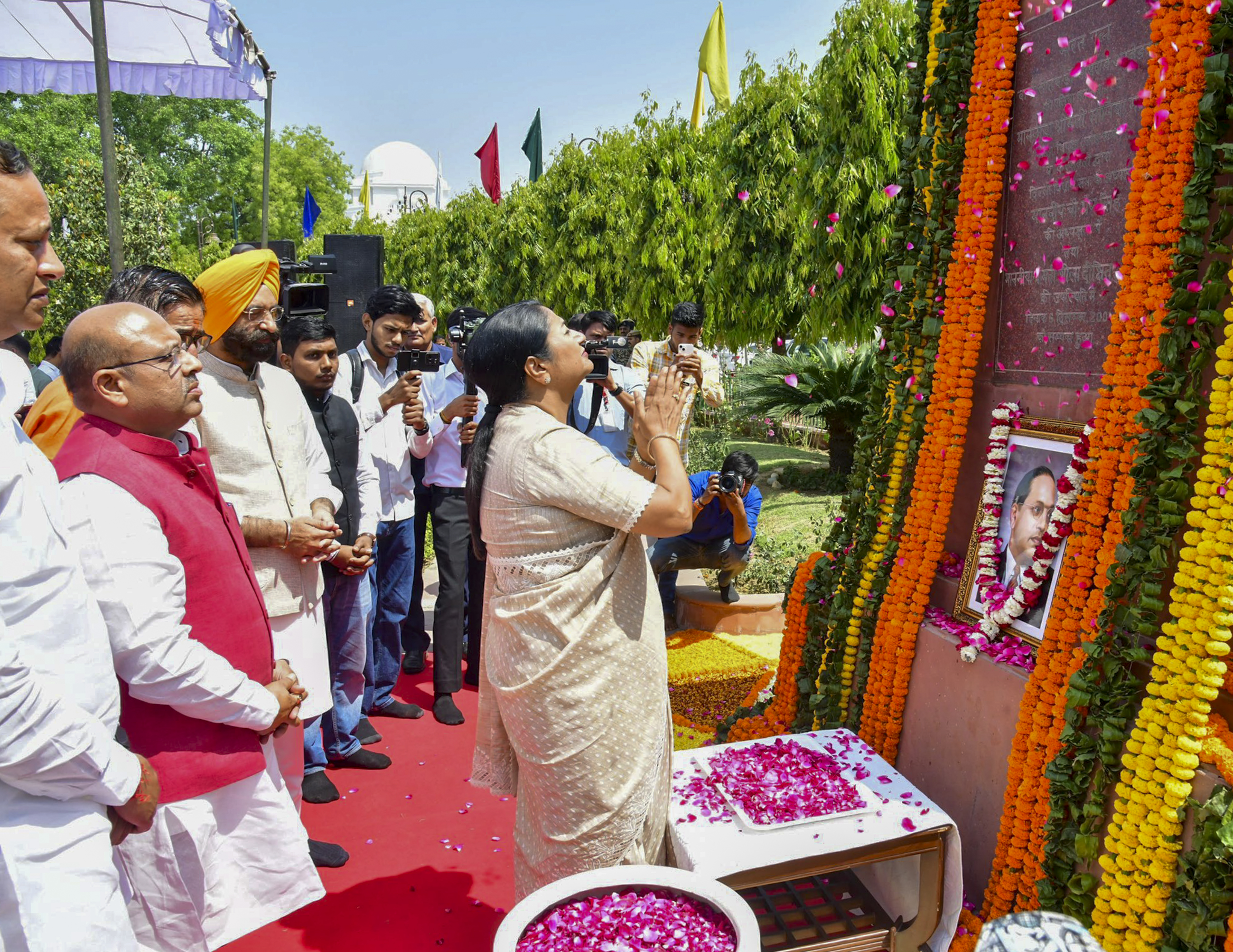 **EDS: THIRD PARTY IMAGE** In this image released by @mssirsa via X on Monday, April 14, 2025, Delhi Chief Minister Rekha Gupta pays tribute to BR Ambedkar on his birth anniversary, at the Delhi assembly premises in New Delhi. (@mssirsa on X via PTI Photo)(PTI04_14_2025_000102B)