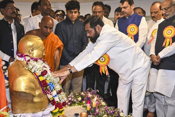 **EDS: THIRD PARTY IMAGE** In this image released by @mieknathshinde via X on Monday, April 14, 2025, Maharashtra Deputy Chief Minister Eknath Shinde pays tribute to BR Ambedkar on his birth anniversary, at Chaityabhoomi, Dadar, in Mumbai. (@mieknathshinde on X via PTI Photo)(PTI04_14_2025_000097B)