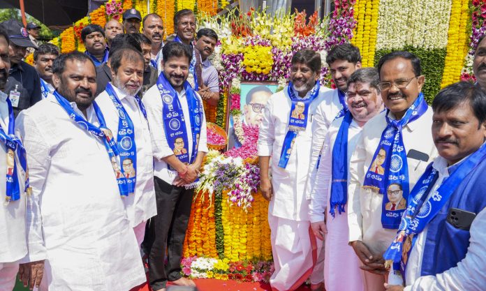 **EDS: THIRD PARTY IMAGE** In this image released by @TelanganaCMO via X on Monday, April 14, 2025, Telangana Chief Minister A Revanth Reddy during a ceremony to pay tribute to BR Ambedkar on his birth anniversary, at Tank Bund, Hyderabad. (@TelanganaCMO on X via PTI Photo)(PTI04_14_2025_000099B)