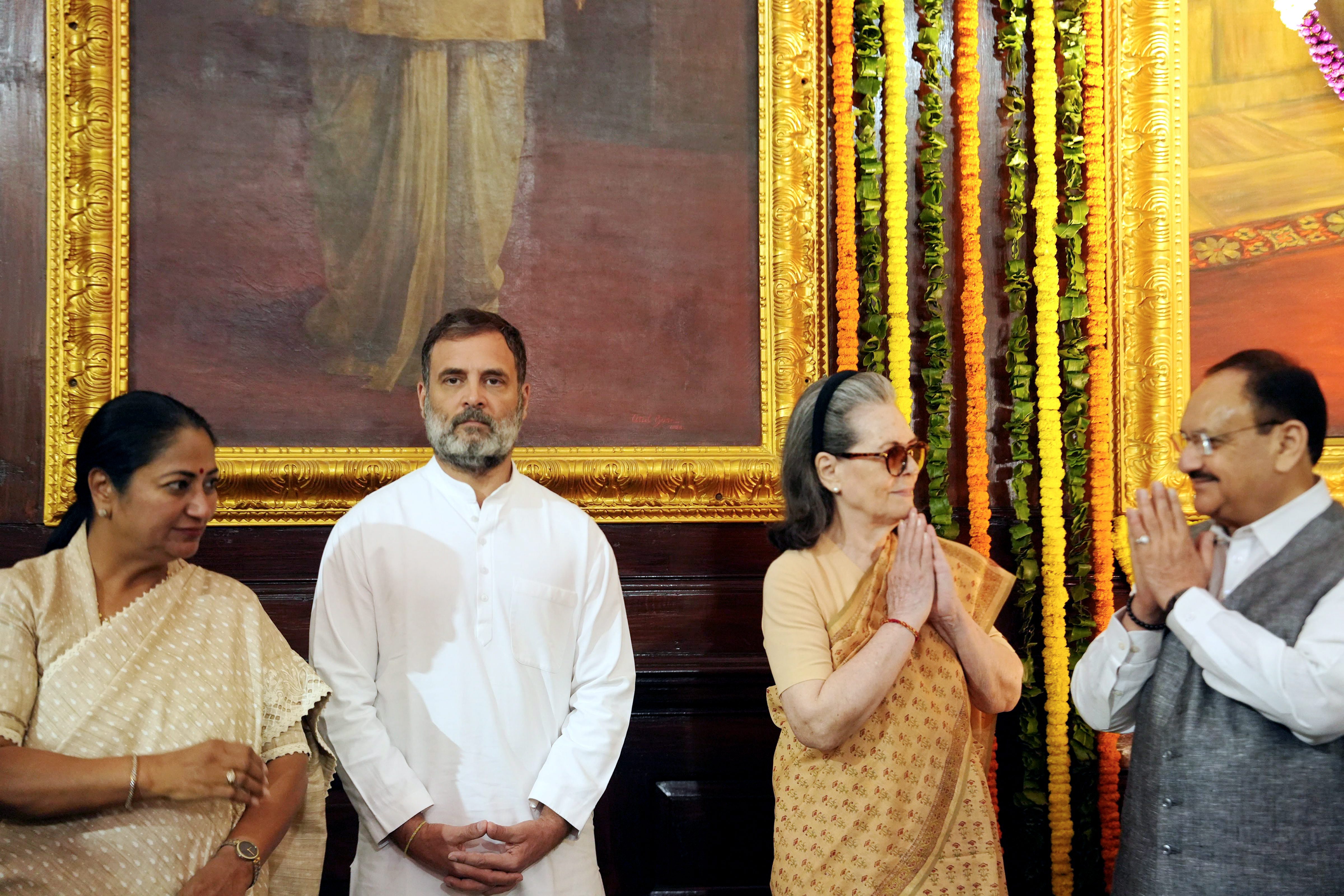 New Delhi: Union Minister JP Nadda meets LoP in the Lok Sabha and Congress leader Rahul Gandhi, party leader Sonia Gandhi, and Delhi Chief Minister Rekha Gupta during a ceremony to pay tribute to BR Ambedkar on his birth anniversary, at the Central Hall of Samvidhan Sadan in New Delhi, Monday, April 14, 2025. (PTI Photo/Arun Sharma)(PTI04_14_2025_000026B)