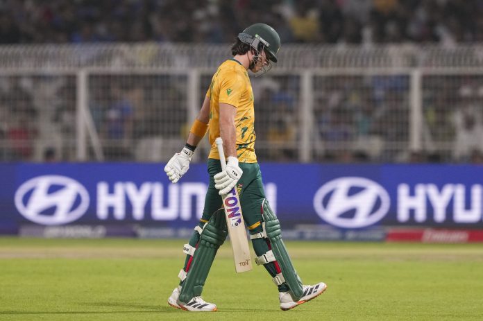 Kolkata: South Africa's Dewald Brevis walks off the field after his dismissal during the ICC Men's T20 World Cup 2026 first semifinal cricket match between New Zealand and South Africa, at Eden Gardens, in Kolkata, Wednesday, March 4, 2026. (PTI Photo/Swapan Mahapatra)(PTI03_04_2026_000341B)