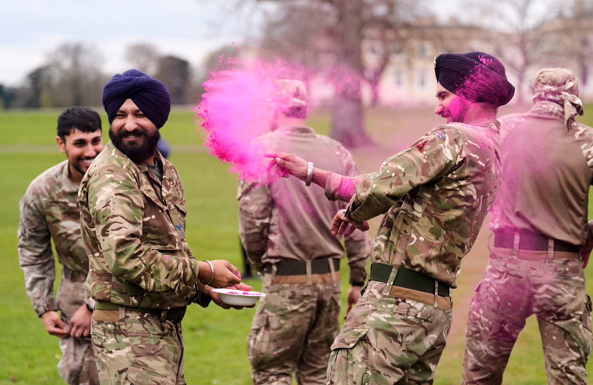 Sikh soldiers of the British Army throw powdered paint as they take part in Rang during the Holla Mahalla Sikh military festival, at the Royal Military Academy Sandhurst, England, Wednesday, April 1, 2026. AP/PTI(AP04_01_2026_000415B)