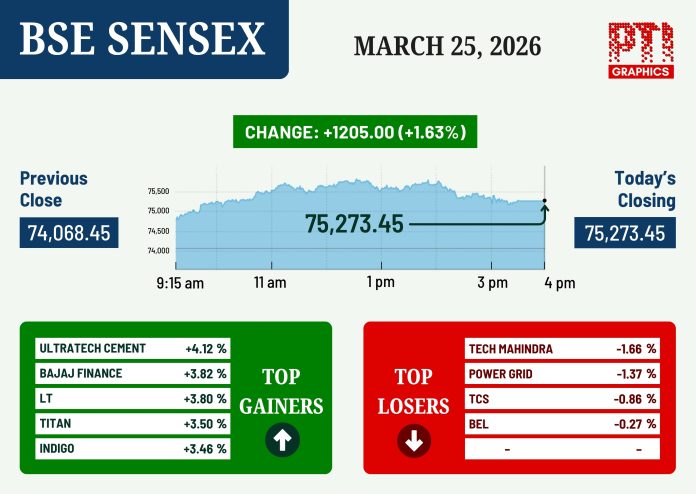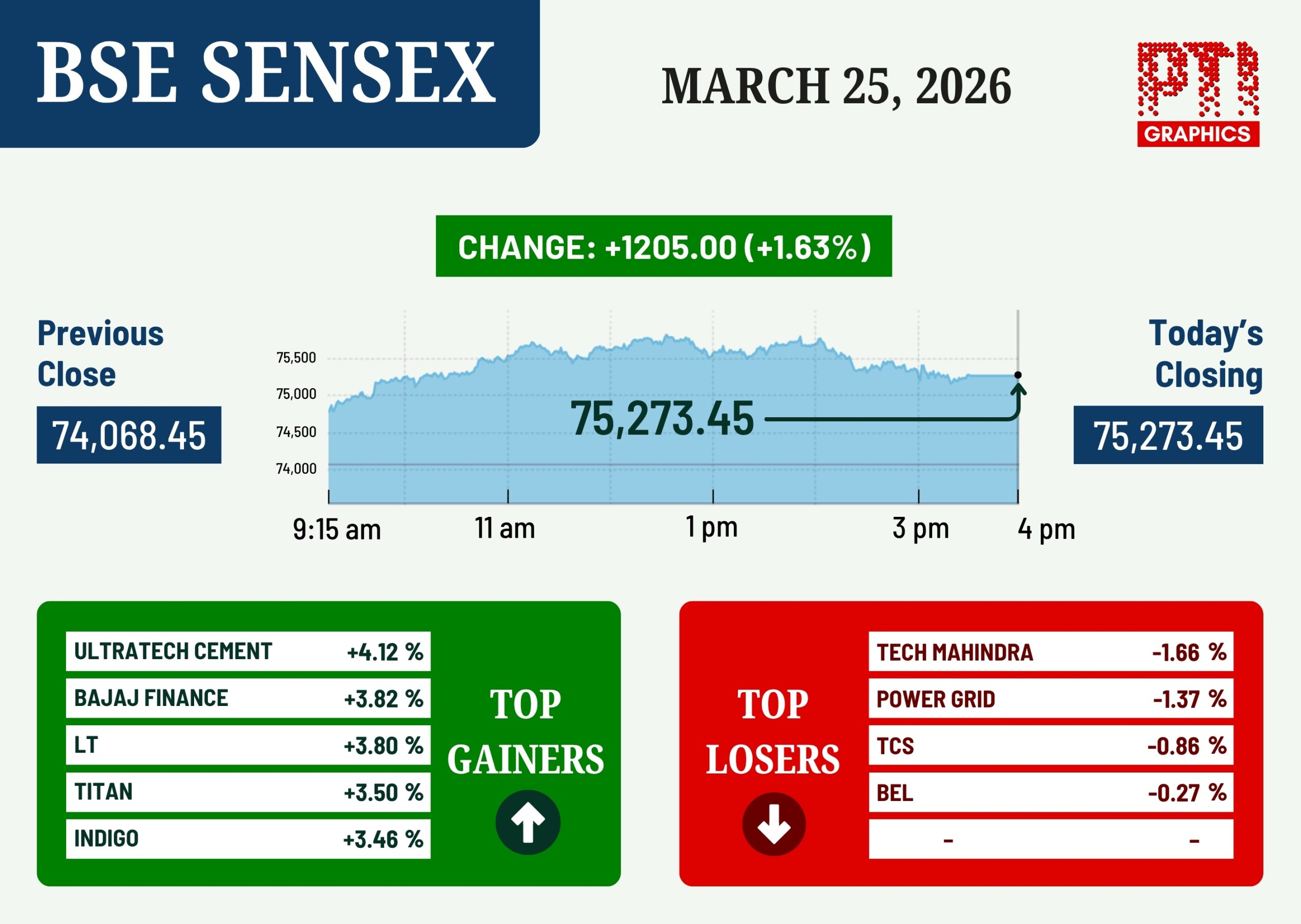 BSE Sensex March 25, 2026 FacebookTwitterPinterestWhatsApp NEW DELHI: BSE SENSEX. PTI GRAPHICS.(PTI03_25_2026_001010002B) BSE Sensex NEW DELHI: BSE SENSEX. PTI GRAPHICS.(PTI03_25_2026_001010002B)