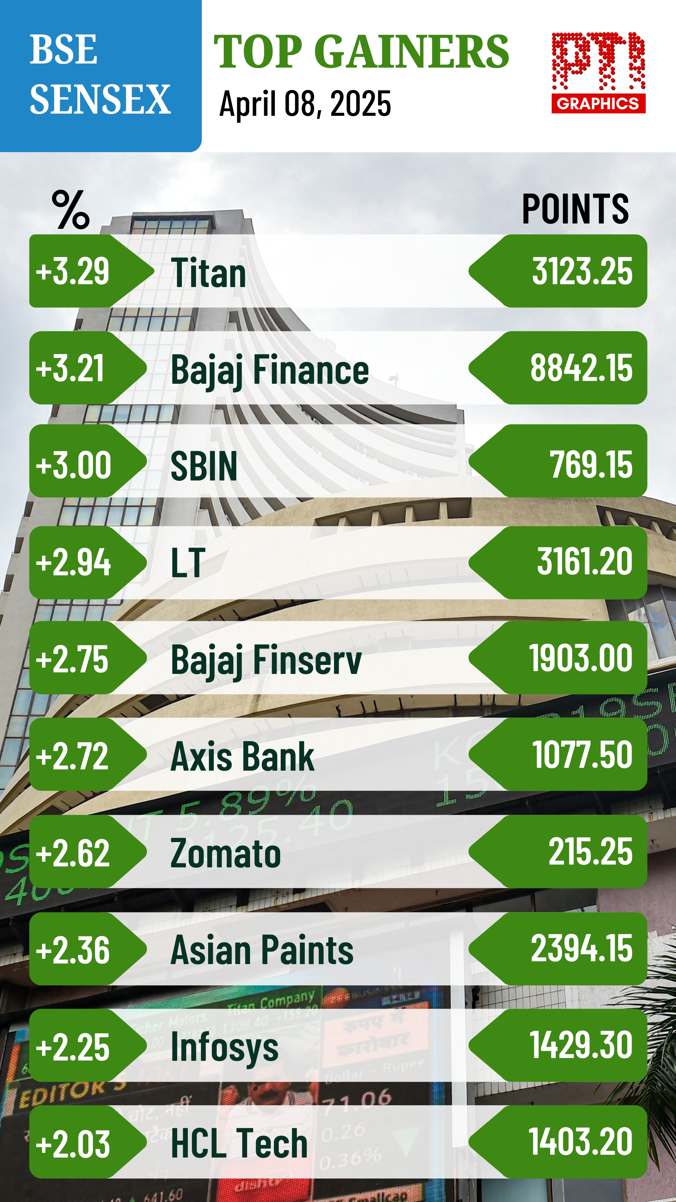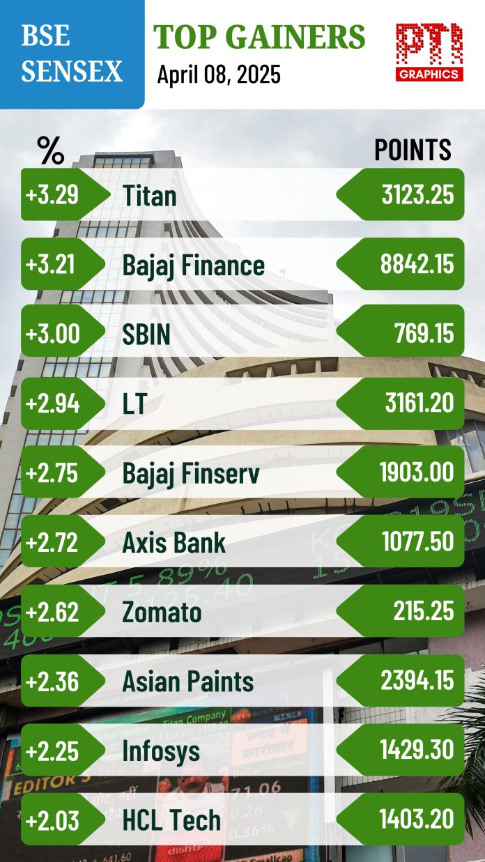 BSE Sensex Top Gainers April 8, 2025 FacebookTwitterPinterestWhatsApp NEW DELHI: BSE SENSEX TOP GAINERS. PTI GRAPHICS.(PTI04_08_2025_001010004B) BSE Sensex Top Gainers NEW DELHI: BSE SENSEX TOP GAINERS. PTI GRAPHICS.(PTI04_08_2025_001010004B)