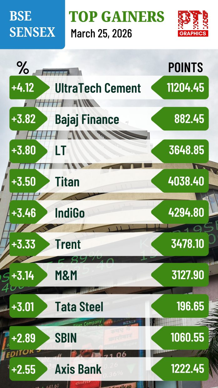 BSE Sensex Top Gainers March 25, 2026 FacebookTwitterPinterestWhatsApp NEW DELHI: BSE SENSEX TOP GAINERS. PTI GRAPHICS.(PTI03_25_2026_001010004B) BSE Sensex Top Gainers NEW DELHI: BSE SENSEX TOP GAINERS. PTI GRAPHICS.(PTI03_25_2026_001010004B)
