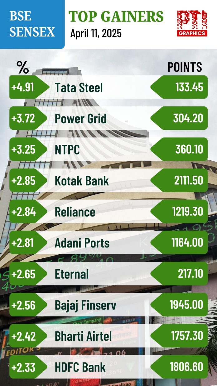 BSE Sensex Top Gainers April 11, 2025 FacebookTwitterPinterestWhatsApp NEW DELHI: BSE SENSEX TOP GAINERS. PTI GRAPHICS.(PTI04_11_2025_001010004B) BSE Sensex Top Gainers NEW DELHI: BSE SENSEX TOP GAINERS. PTI GRAPHICS.(PTI04_11_2025_001010004B)