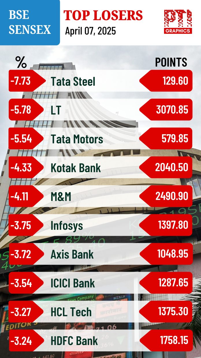 BSE Sensex Top Losers April 7, 2025 FacebookTwitterPinterestWhatsApp NEW DELHI: BSE SENSEX TOP LOSERS. PTI GRAPHICS.(PTI04_07_2025_001010005B) BSE Sensex Top Losers NEW DELHI: BSE SENSEX TOP LOSERS. PTI GRAPHICS.(PTI04_07_2025_001010005B)