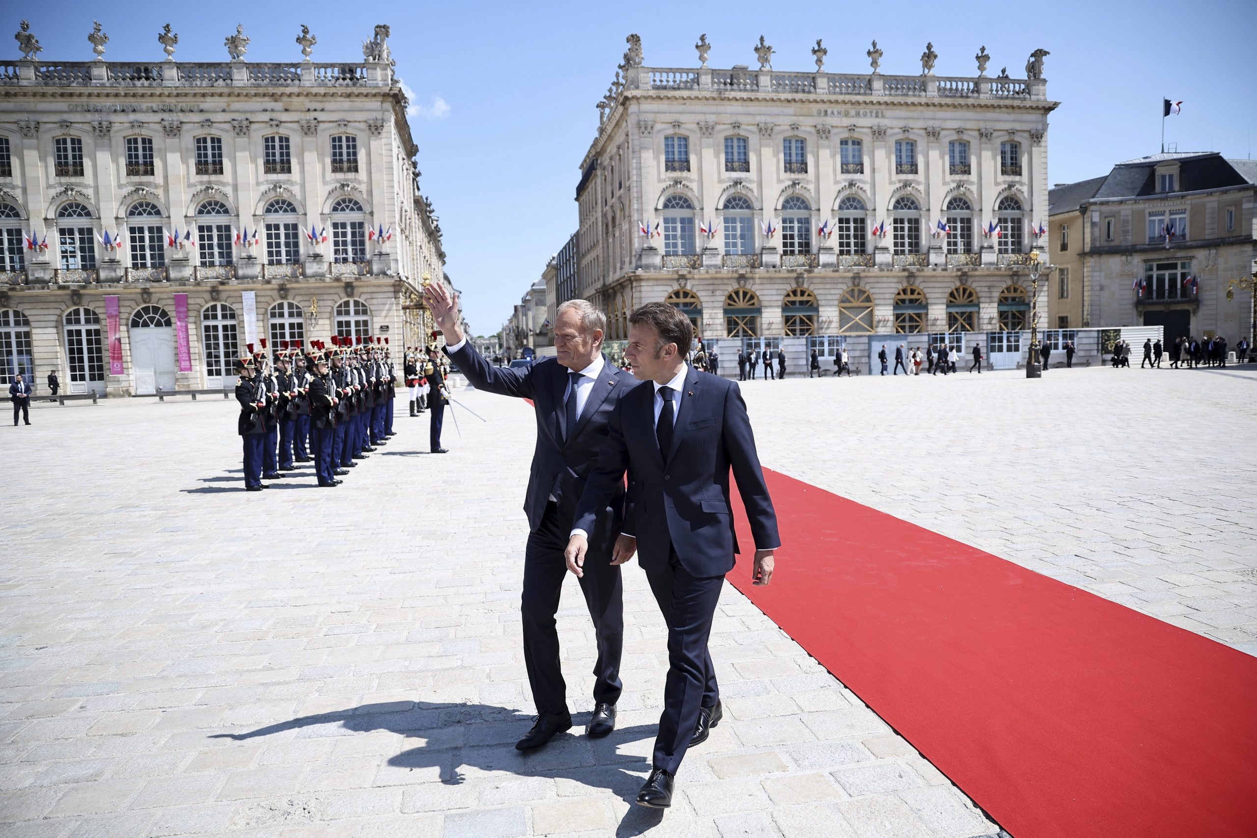 French President Emmanuel Macron and Polish Prime Minister Donald Tusk arrive on Stanislas square before signing a treaty of friendship and enhanced cooperation between the two countries in Nancy, eastern France, Friday, May 9, 2025. AP/PTI(AP05_09_2025_000271B)