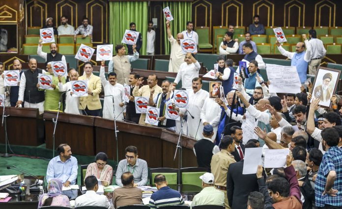 Jammu: BJP MLAs stage a protest during the Budget session of the Jammu and Kashmir Assembly, in Jammu, Friday, March 27, 2026. (PTI Photo)(PTI03_27_2026_000050B)