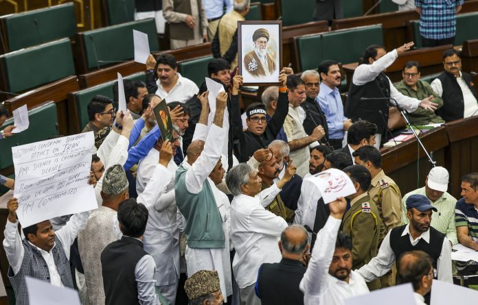 Jammu: Jammu & Kashmir National Conference MLAs stage a protest during the Budget session of the Legislative Assembly, in Jammu, Friday, March 27, 2026. (PTI Photo)(PTI03_27_2026_000051B)