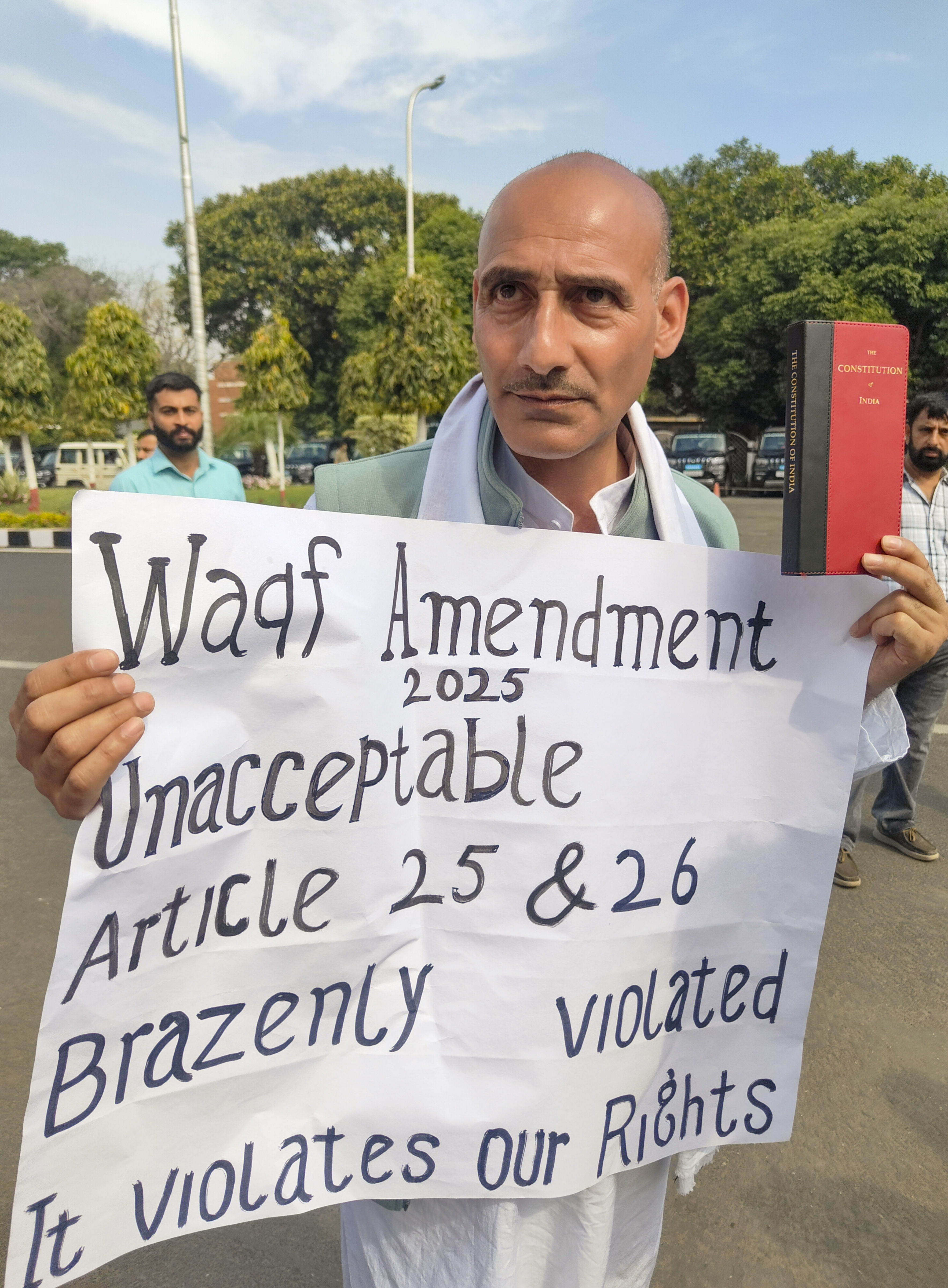 Jammu: Congress MLA Irfan Hafiz Lone protests against the Waqf (Amendment) Act, 2025, during the Budget session of the J&K Assembly, in Jammu, Monday, April 7, 2025. (PTI Photo)(PTI04_07_2025_000170B)