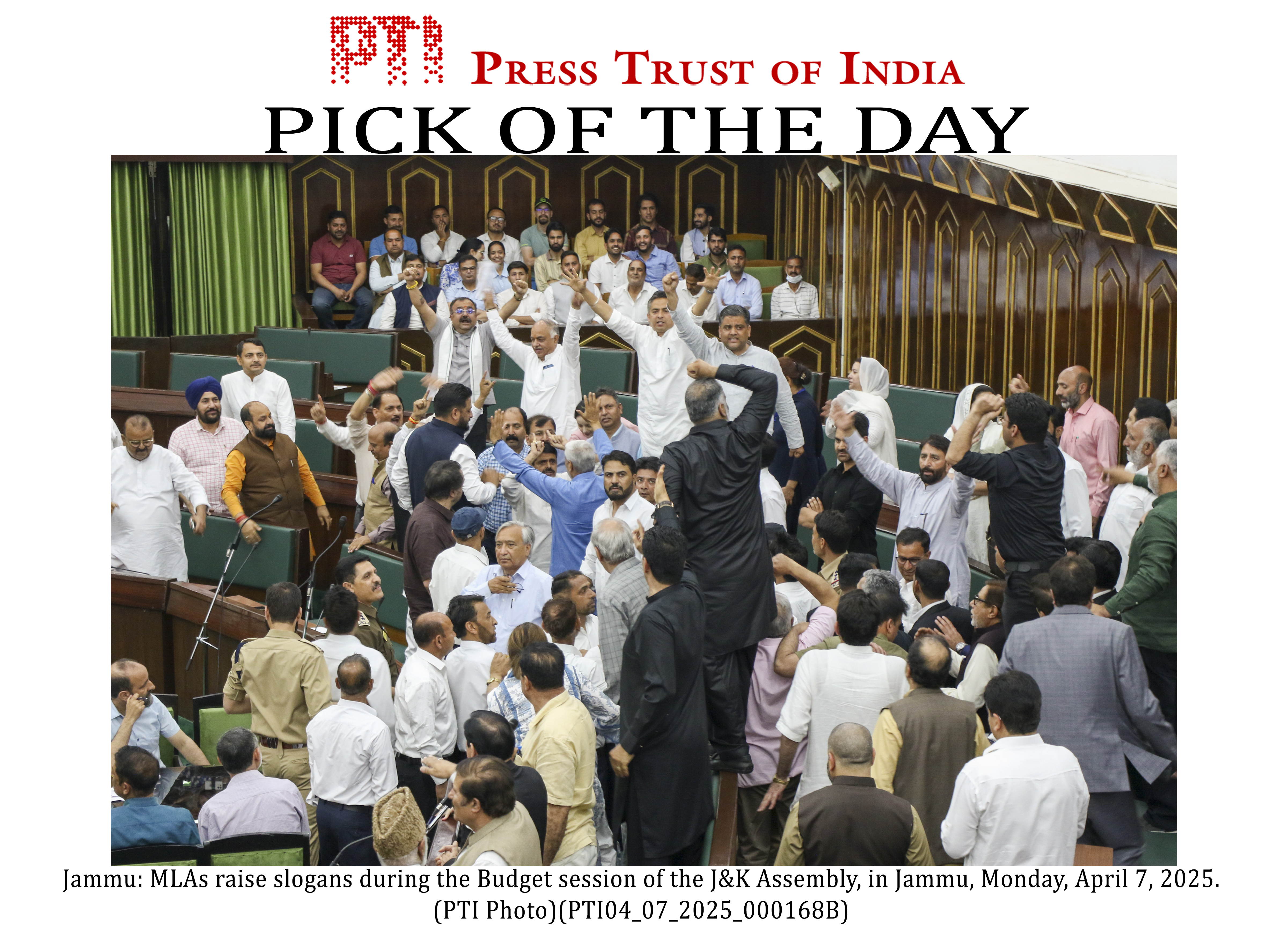 PLS TAKE NOTE OF THIS PTI PICK OF THE DAY::: Jammu: MLAs raise slogans during the Budget session of the J&K Assembly, in Jammu, Monday, April 7, 2025. (PTI Photo)(PTI04_07_2025_000168B)(PTI04_07_2025_000255B)
