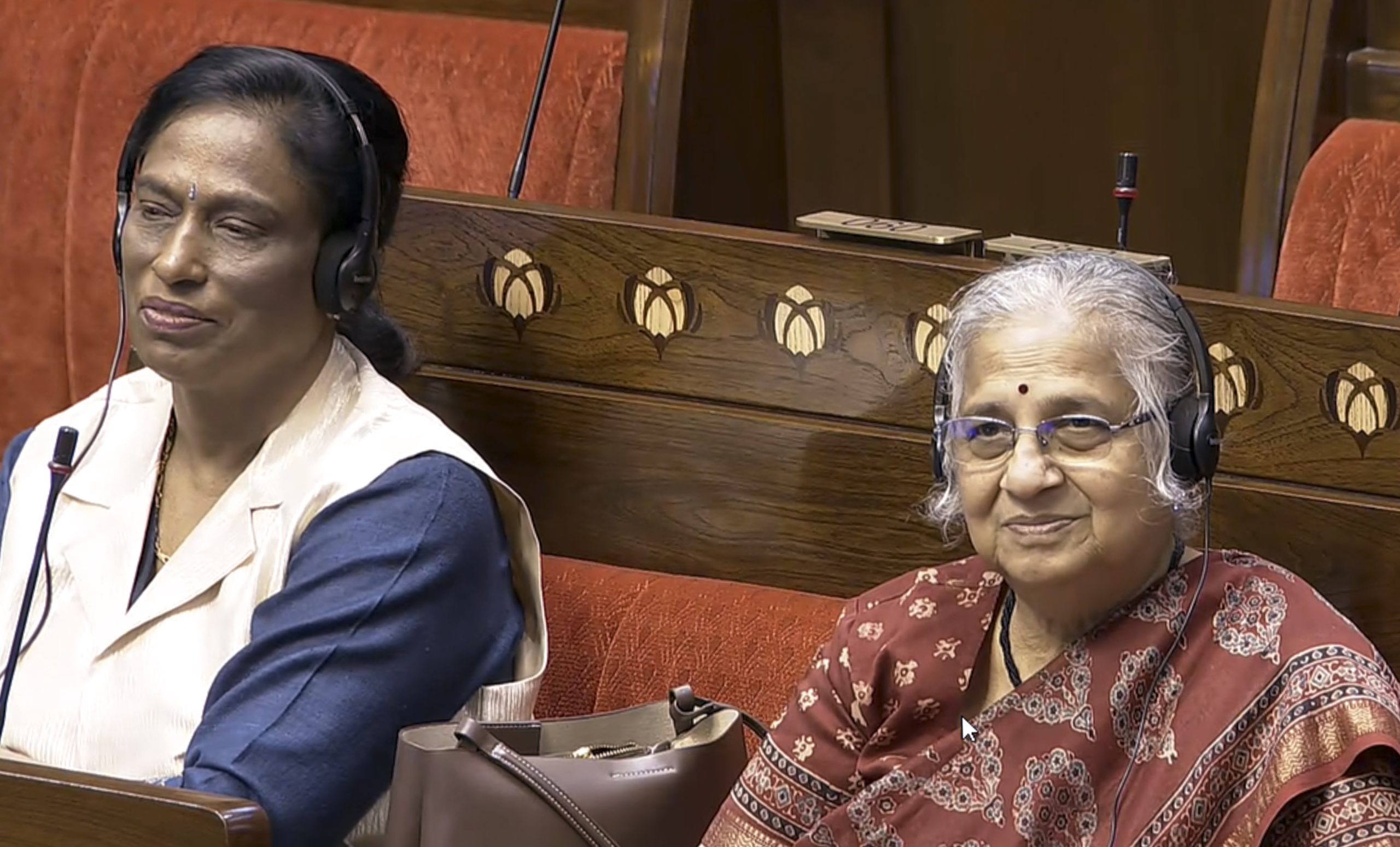 **EDS: THIRD PARTY IMAGE; SCREENGRAB VIA SANSAD TV** New Delhi: Rajya Sabha MPs Sudha Murty, right, and PT Usha in the House during the second part of the Budget session of Parliament, in New Delhi, Wednesday, March 25, 2026. (Sansad TV via PTI Photo)(PTI03_25_2026_000141B)