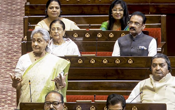 **EDS: THIRD PARTY IMAGE; SCREENGRAB VIA SANSAD TV** New Delhi: Samajwadi Party (SP) MP Jaya Bachchan speaks in the Rajya Sabha during the second part of the Budget session of Parliament, in New Delhi, Wednesday, March 25, 2026. (Sansad TV via PTI Photo) (PTI03_25_2026_000248B)