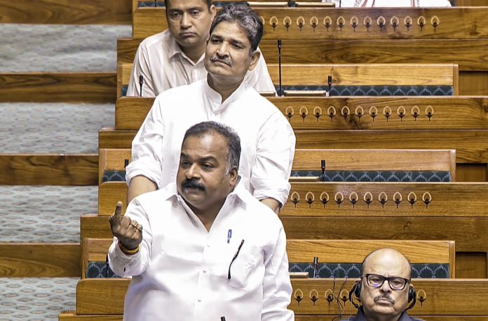 **EDS: THIRD PARTY IMAGE; SCREENGRAB VIA SANSAD TV** New Delhi: Congress MP Manickam Tagore speaks in the Lok Sabha during the second part of the Budget session of Parliament, in New Delhi, Friday, March 27, 2026. (Sansad TV via PTI Photo)(PTI03_27_2026_000100B)