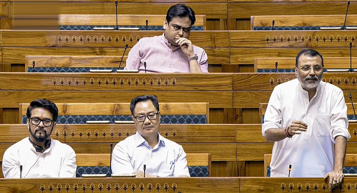 **EDS: THIRD PARTY IMAGE; SCREENGRAB VIA SANSAD TV** New Delhi: BJP MP Nishikant Dubey speaks in the Lok Sabha during the second part of the Budget session of Parliament, in New Delhi, Friday, March 27, 2026. (Sansad TV via PTI Photo)(PTI03_27_2026_000192B)