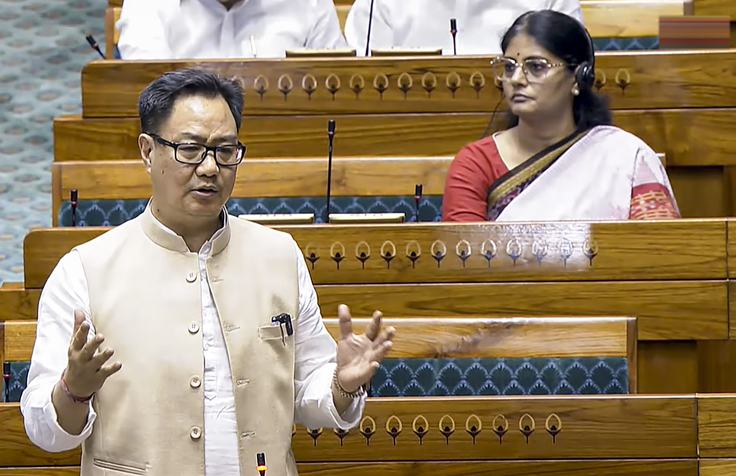 **EDS: THIRD PARTY IMAGE; SCREENGRAB VIA SANSAD TV** New Delhi: Union Minister Kiren Rijiju speaks in the Lok Sabha during the second part of the Budget session of Parliament, in New Delhi, Monday, March 30, 2026. (Sansad TV via PTI Photo)(PTI03_30_2026_000084B)