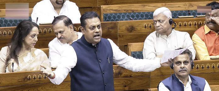 **EDS: THIRD PARTY IMAGE; SCREENGRAB VIA SANSAD TV** New Delhi: BJP MP Sambit Patra speaks in the Lok Sabha during the second part of the Budget session of Parliament, in New Delhi, Monday, March 30, 2026. (Sansad TV via PTI Photo)(PTI03_30_2026_000171B)