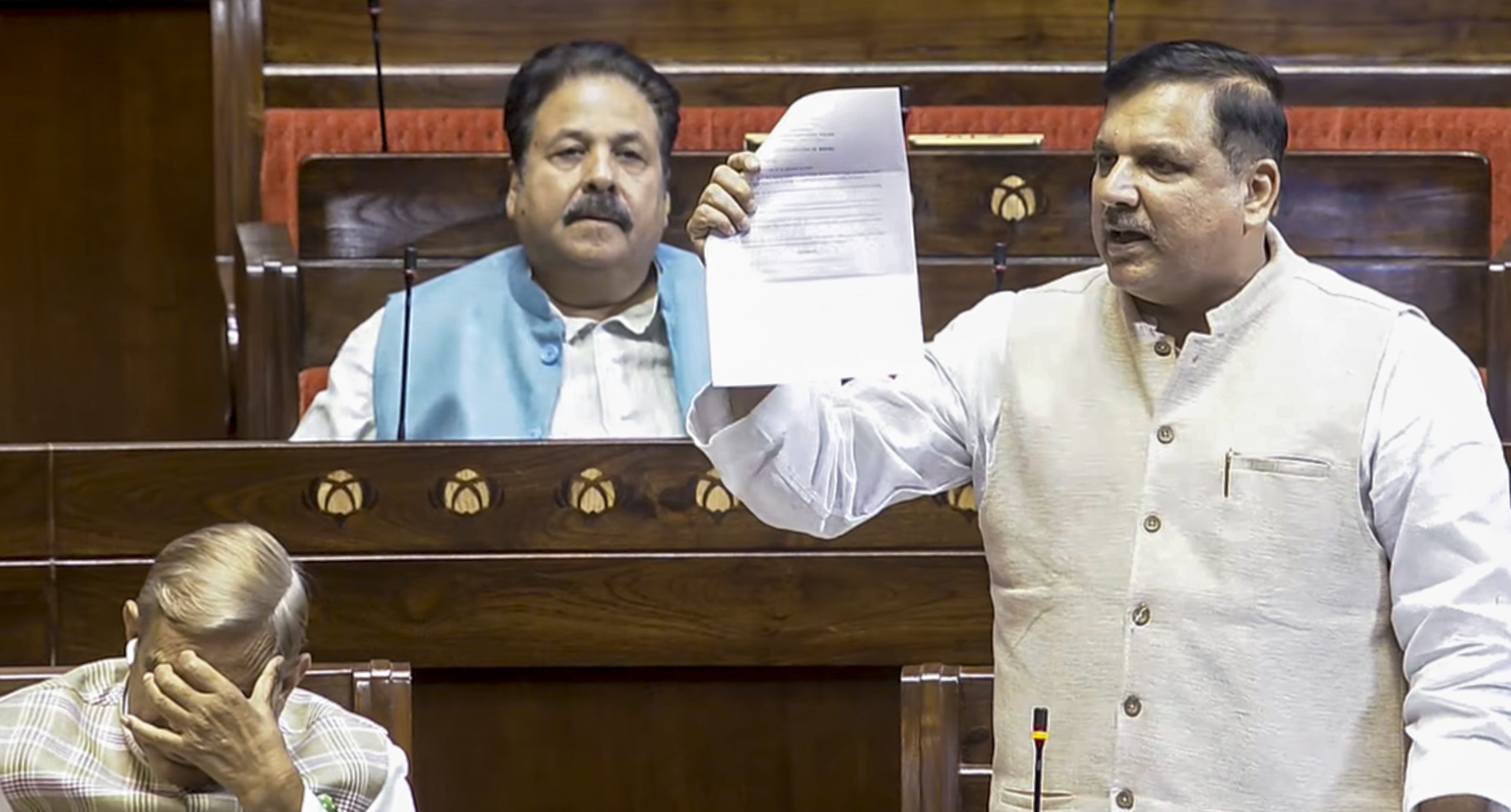 **EDS: THIRD PARTY IMAGE; SCREENGRAB VIA SANSAD TV** New Delhi: AAP MP Sanjay Singh speaks in the Rajya Sabha during the second part of the Budget session of Parliament, in New Delhi, Wednesday, April 1, 2026. (Sansad TV via PTI Photo)(PTI04_01_2026_000277B)
