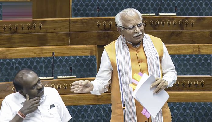 **EDS: THIRD PARTY IMAGE; SCREENGRAB VIA SANSAD TV** New Delhi: Union Minister of Housing and Urban Affairs Manohar Lal speaks in the Lok Sabha during the second part of the Budget session of Parliament, in New Delhi, Thursday, April 2, 2026. (Sansad TV via PTI Photo)(PTI04_02_2026_000034B)