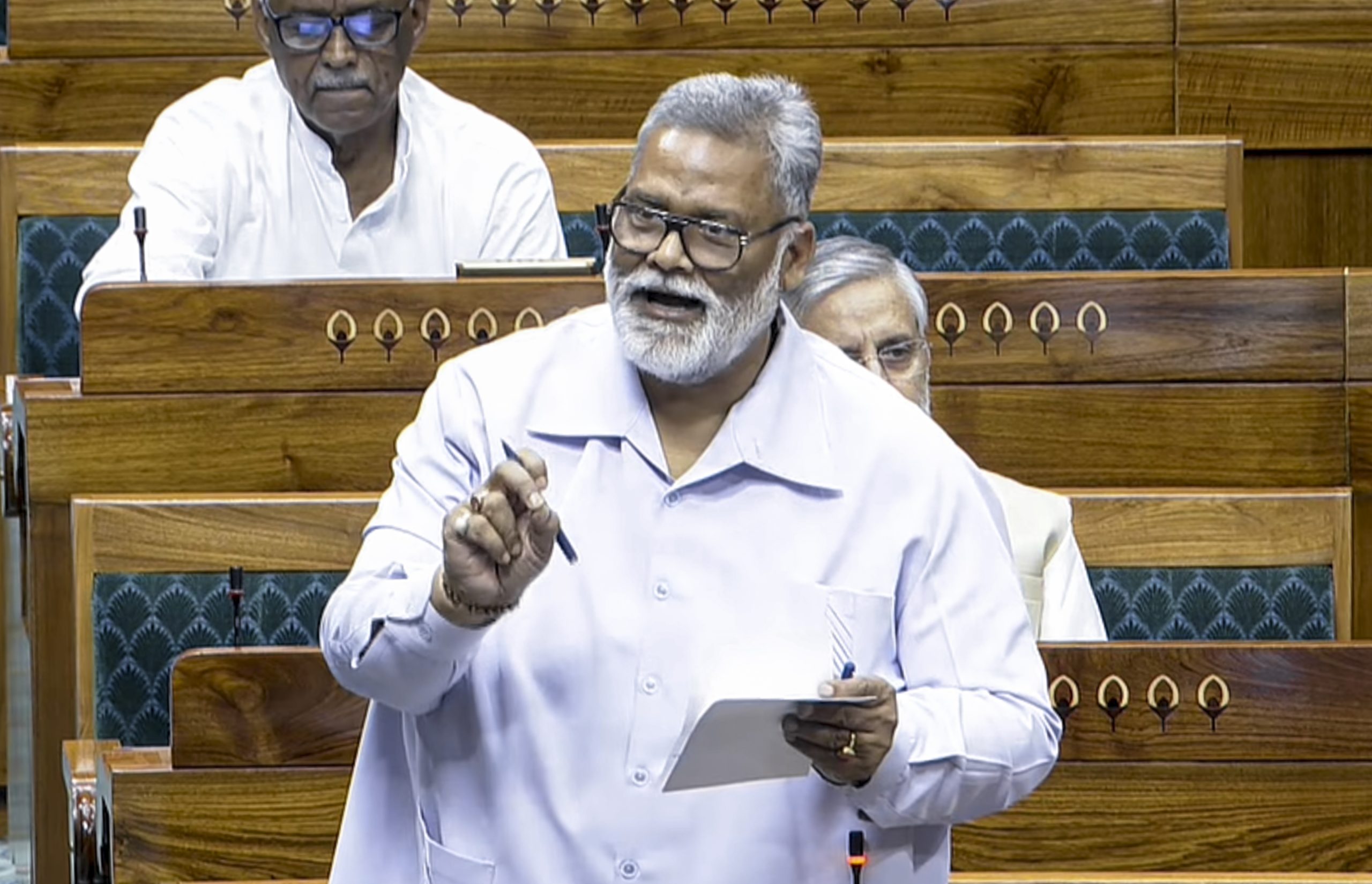 **EDS: THIRD PARTY IMAGE; SCREENGRAB VIA SANSAD TV** New Delhi: Independent MP Pappu Yadav speaks in the Lok Sabha during the second part of the Budget session of Parliament, in New Delhi, Thursday, April 2, 2026. (Sansad TV via PTI Photo)(PTI04_02_2026_000041B)