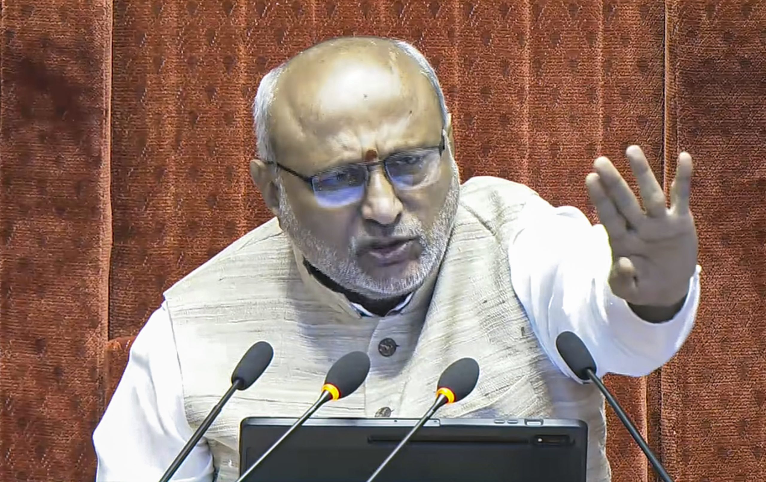 **EDS: THIRD PARTY IMAGE; SCREENGRAB VIA SANSAD TV** New Delhi: Rajya Sabha Chairman CP Radhakrishnan conducts proceedings in the House during the second part of the Budget session of Parliament, in New Delhi, Thursday, April 2, 2026. (Sansad TV via PTI Photo)(PTI04_02_2026_000112B)
