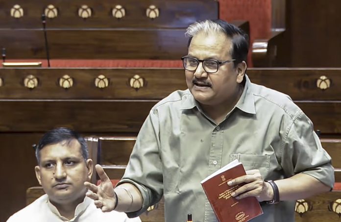 **EDS: THIRD PARTY IMAGE; SCREENGRAB VIA SANSAD TV** New Delhi: RJD MP Manoj Kumar Jha speaks in the Rajya Sabha during the second part of the Budget session of Parliament, in New Delhi, Thursday, April 2, 2026. (Sansad TV via PTI Photo)(PTI04_02_2026_000134B)