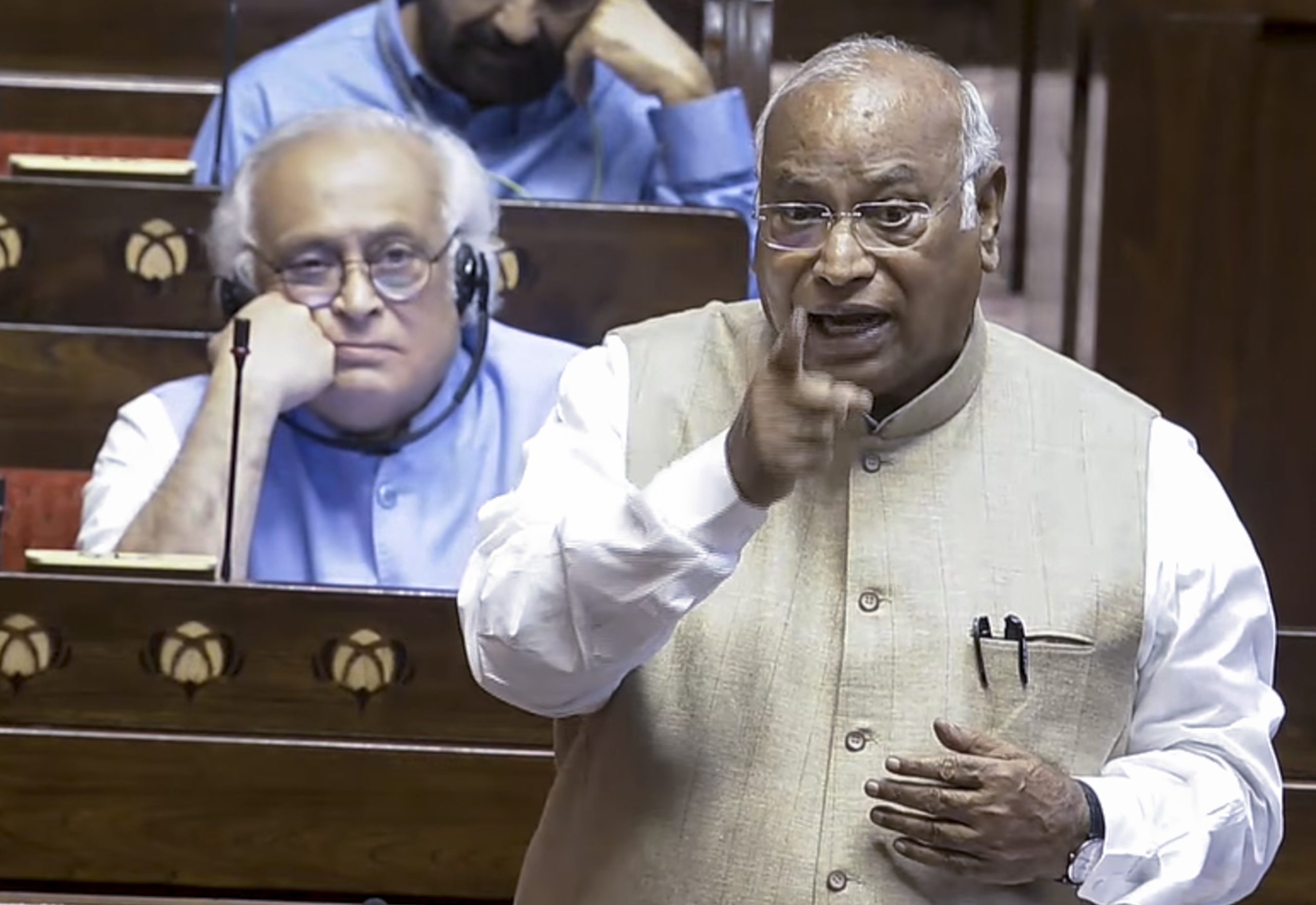 **EDS: THIRD PARTY IMAGE; SCREENGRAB VIA SANSAD TV** New Delhi: LoP in the Rajya Sabha and Congress President Mallikarjun Kharge speaks in the House during the second part of the Budget session of Parliament, in New Delhi, Thursday, April 2, 2026. (Sansad TV via PTI Photo)(PTI04_02_2026_000135B)