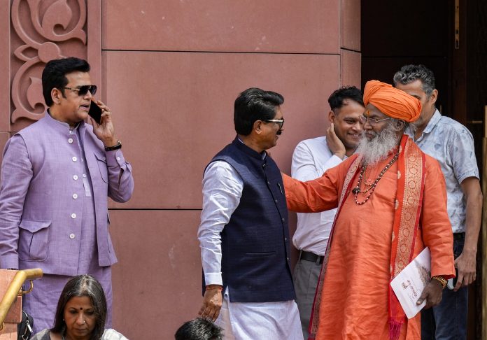 New Delhi: BJP MPs Sakshi Maharaj, Ravi Kishan, and others, during the second part of the Budget session of Parliament, in New Delhi, Thursday, April 2, 2026. (PTI Photo/Salman Ali)(PTI04_02_2026_000165B)