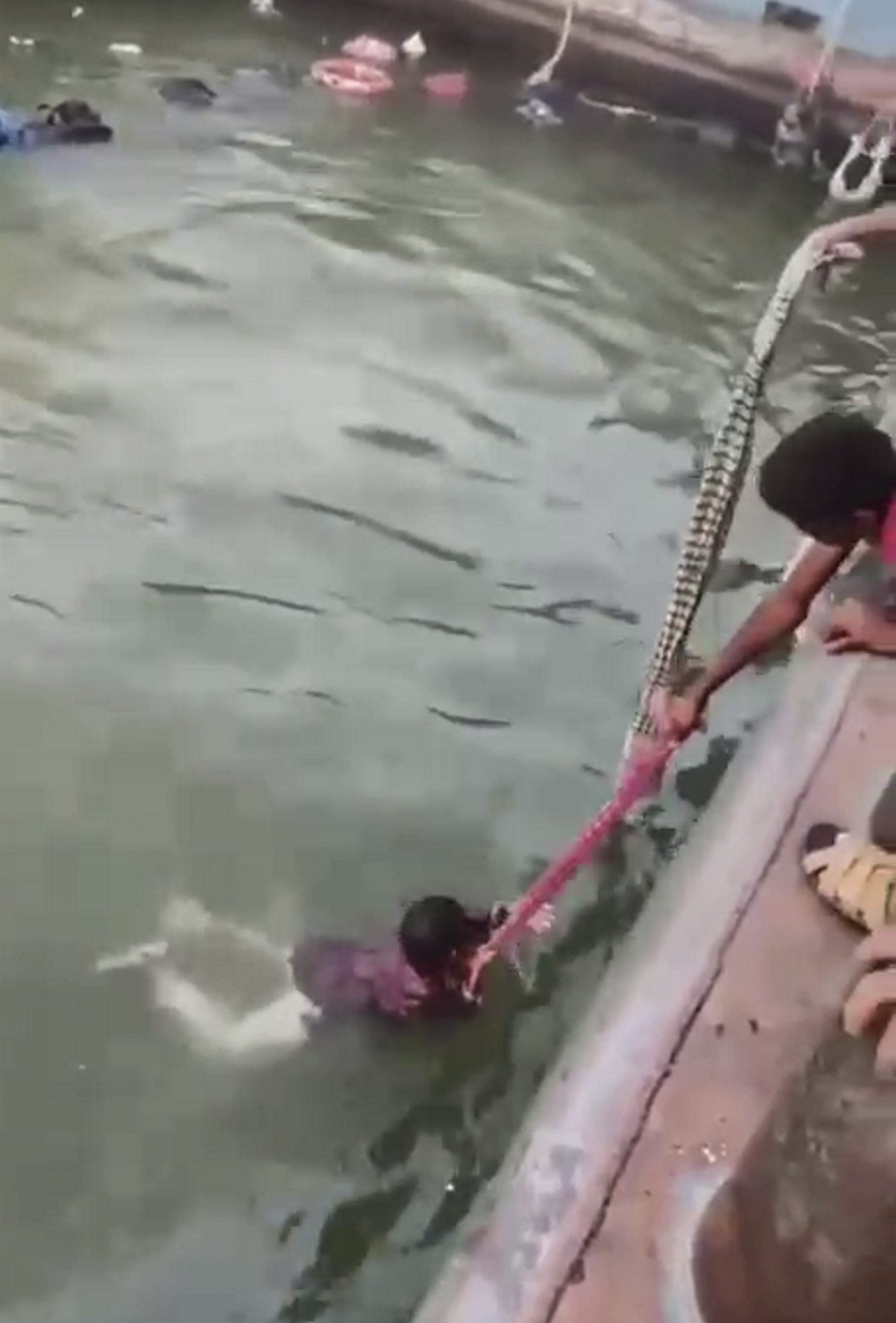 **EDS: TO GO WITH STORY FGN58** Rajbari: A man pulls a child as he swims to the surface after a bus carrying at least 40 people plunged into the Padma river at the Dauladia terminal, in Rajbari district, Bangladesh, Wednesday, March 25, 2026. (PTI Photo) (PTI03_25_2026_000393B)