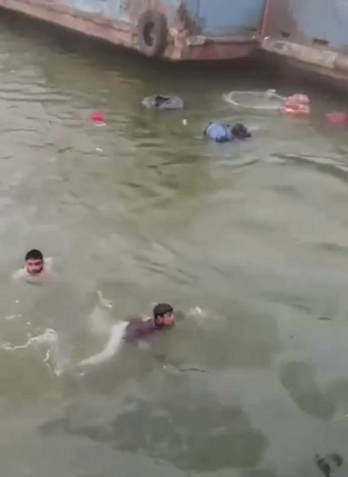**EDS: TO GO WITH STORY FGN58** Rajbari: People swim to the surface after a bus carrying at least 40 people plunged into the Padma river at the Dauladia terminal, in Rajbari district, Bangladesh, Wednesday, March 25, 2026. (PTI Photo) (PTI03_25_2026_000392B)