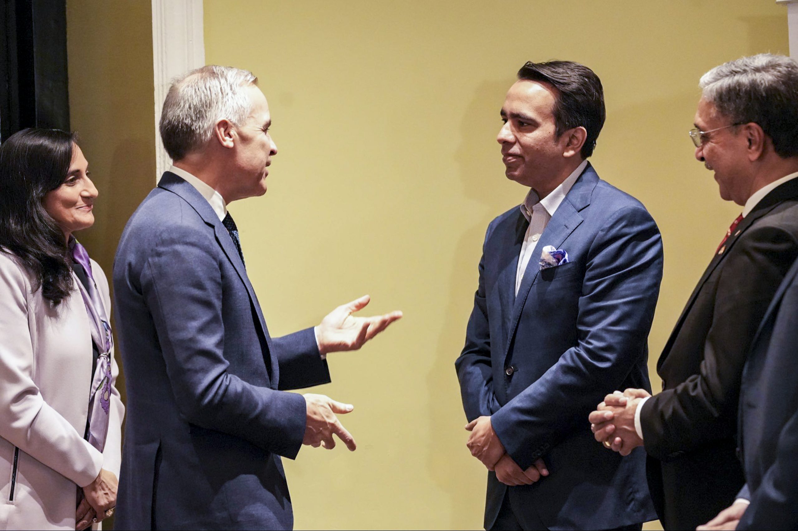 **EDS: THIRD PARTY IMAGE** In this image posted on Feb. 28, 2026, Union Minister of State Jayant Chaudhary meets Canadian Prime Minister Mark Carney at the launch of the India–Canada Talent and Innovation Strategy. (@jayantrld/X via PTI Photo)(PTI02_28_2026_000418B)