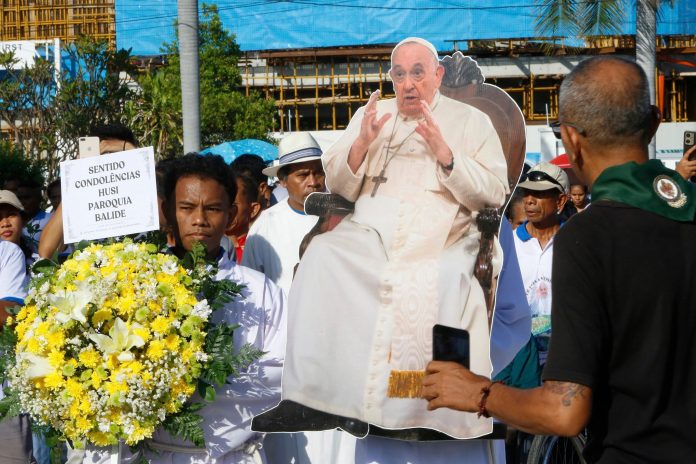 Devotees carry a cutout of the late Pope Francis during a procession ahead of a prayer in Dili, East Timor, Tuesday, April 22, 2025.AP/PTI(AP04_22_2025_000006B)