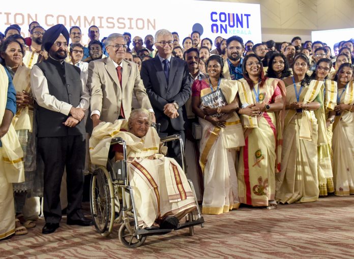 Kochi: Chief Election Commissioner Gyanesh Kumar, Election Commissioners Sukhbir Singh Sandhu and Vivek Joshi with PV Visalam, a 96-year-old voter, during an event for the upcoming Kerala Assembly elections, in Kochi, Saturday, March 7, 2026. (PTI Photo) (PTI03_07_2026_000307B)