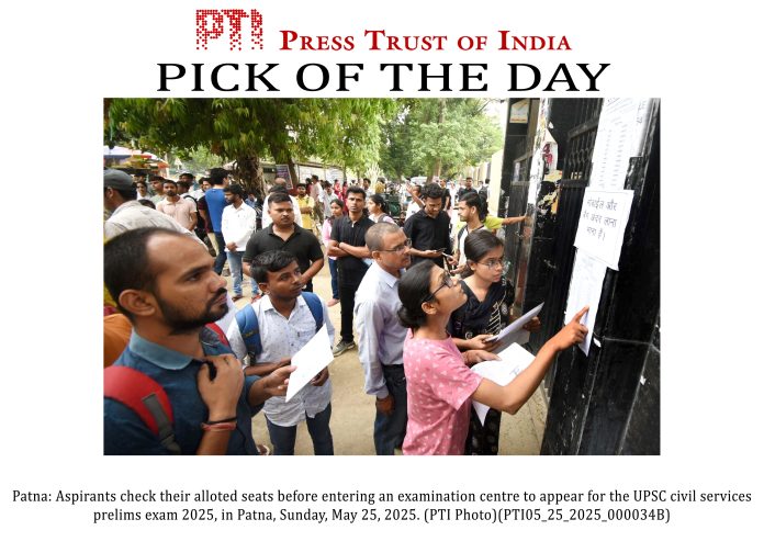 PLS TAKE NOTE OF THIS PTI PICK OF THE DAY::: Patna: Aspirants check their alloted seats before entering an examination centre to appear for the UPSC civil services prelims exam 2025, in Patna, Sunday, May 25, 2025. (PTI Photo)(PTI05_25_2025_000034B)(PTI05_25_2025_000347B)