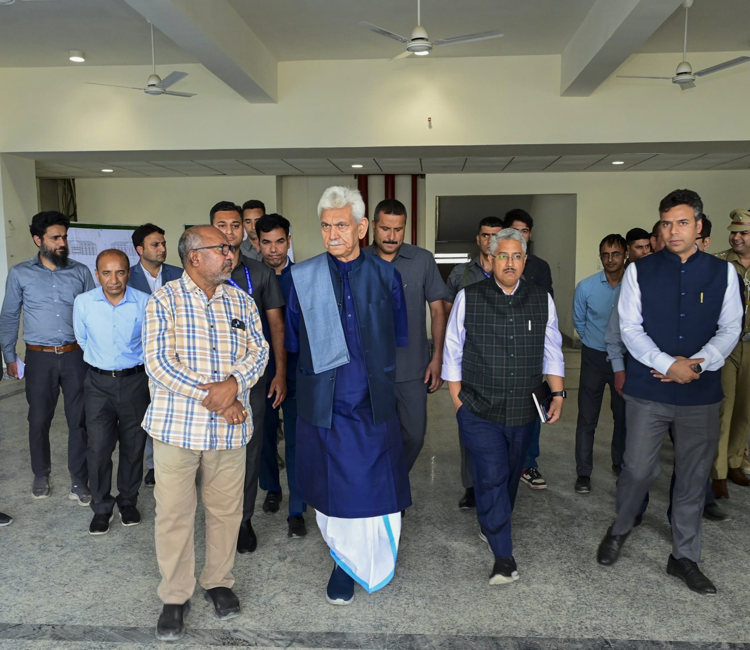 **EDS: THIRD PARTY IMAGE** In this image released by @OfficeOfLGJandK via X on May 5, 2025, J&K LG Manoj Sinha reviews progress of construction work for Office and Yatri Niwas of Amarnath Shrine Board at Pantha Chowk, Srinagar. (@OfficeOfLGJandK via PTI Photo)(PTI05_05_2025_000250B)