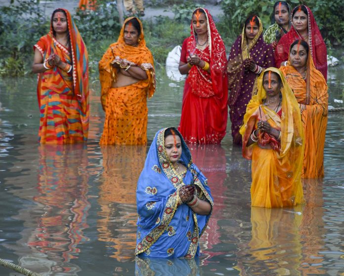 Guwahati: Women perform rituals in the Brahmaputra river during �Chaiti Chhath� festival, in Guwahati, Assam, Tuesday, March 24, 2026. (PTI Photo) (PTI03_24_2026_000300B)