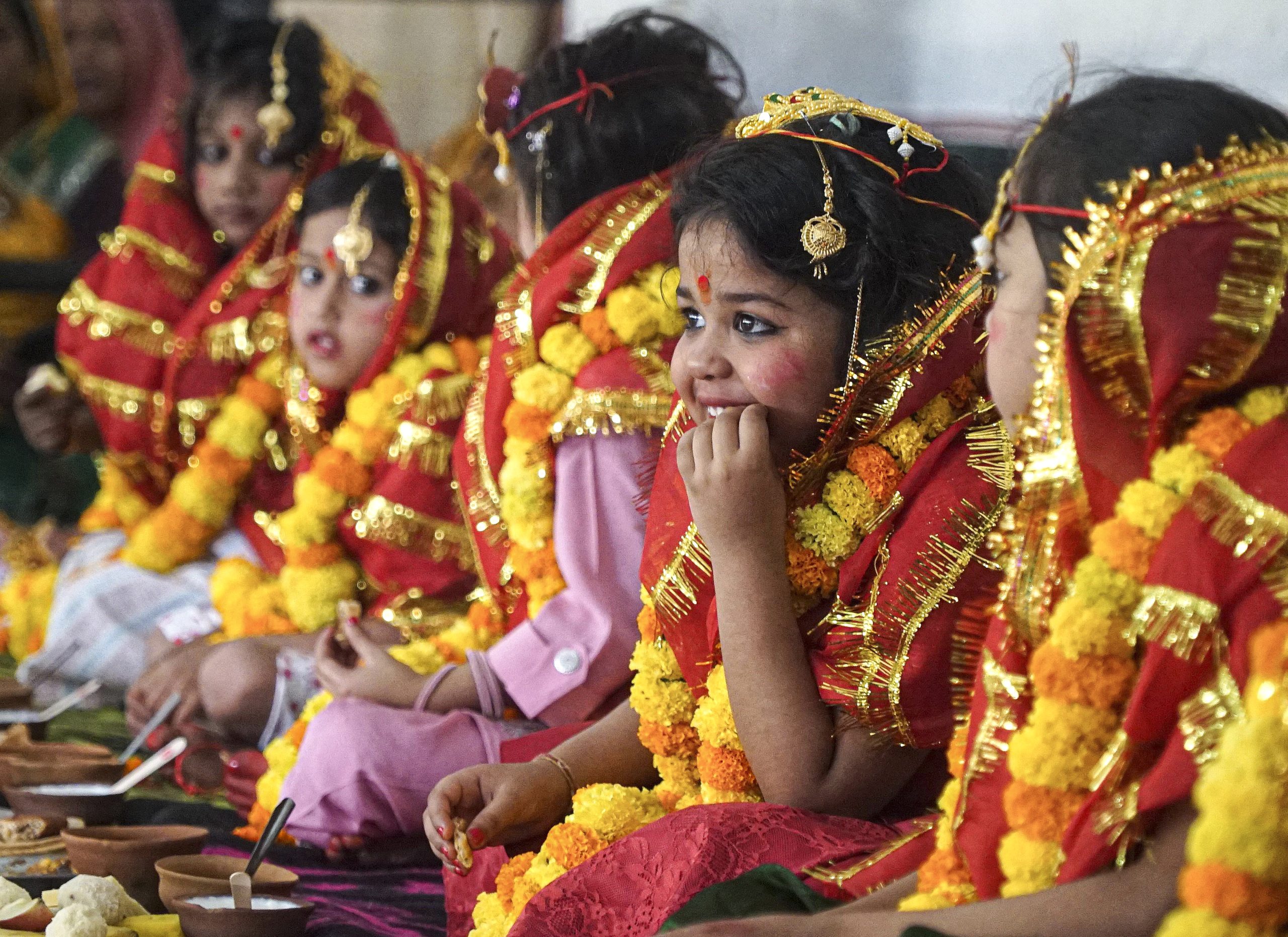 Varanasi: Young girls dressed as goddesses are offered food during �Nav Kanya-Bhairav� on the ninth day of �Chaitra Navaratri� festival, at Baba Keenaram Ashram, in Varanasi, Uttar Pradesh, Friday, March 27, 2027. (PTI Photo)(PTI03_27_2026_000189B)