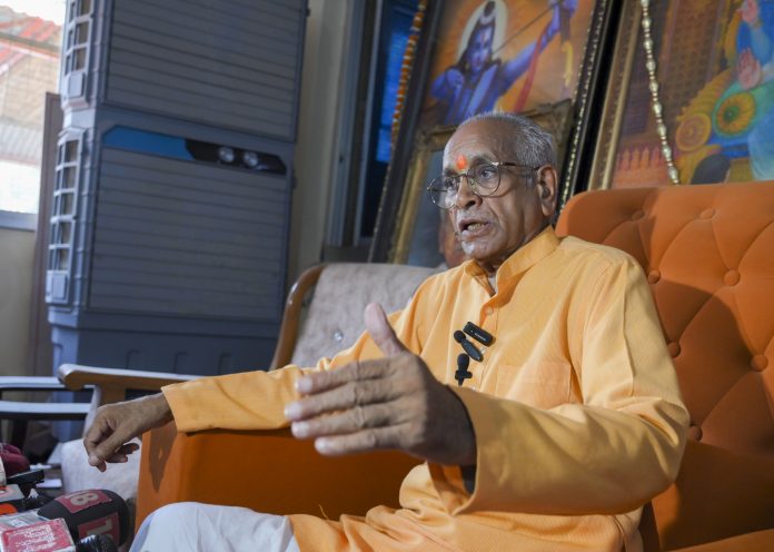 Ayodhya: General Secretary of Shri Ram Janmabhoomi Teerth Kshetra (SRJTK) Champat Rai addresses a press conference in Karsewakpuram, Ayodhya, Wednesday, Apr. 9, 2025. (PTI Photo) (PTI04_09_2025_000212B)