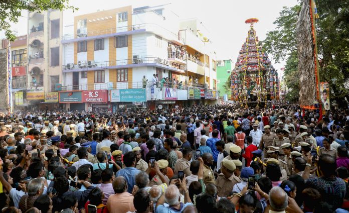 Chennai: People participate in the chariot festival of Mylapore Kapaleeswarar Temple, in Chennai, Wednesday, Apr. 9, 2025. (PTI Photo) (PTI04_09_2025_000200B)
