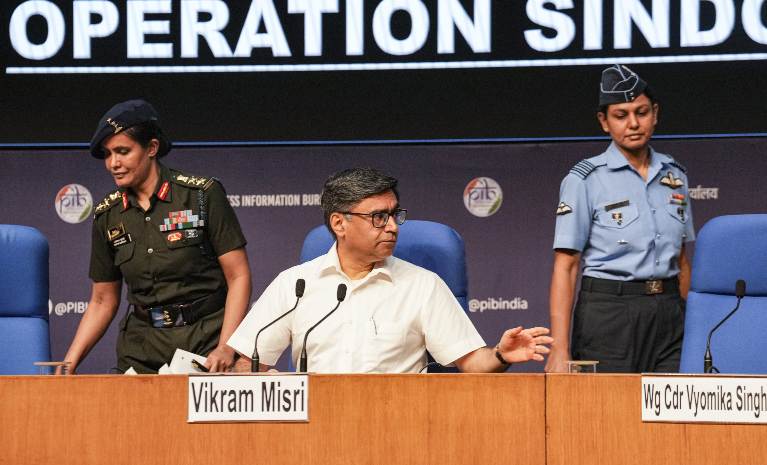New Delhi: Foreign Secretary Vikram Misri with Army's Col Sofiya Qureshi and IAF Wing Commander Vyomika Singh during a press conference regarding 'Operation Sindoor', in New Delhi, Wednesday, May 7, 2025. Indian armed forces carried out missile strikes on terror targets in Pakistan and PoK under 'Operation Sindoor', in retaliation for the Pahalgam terror attack. (PTI Photo/Kamal Kishore)(PTI05_07_2025_000123B)