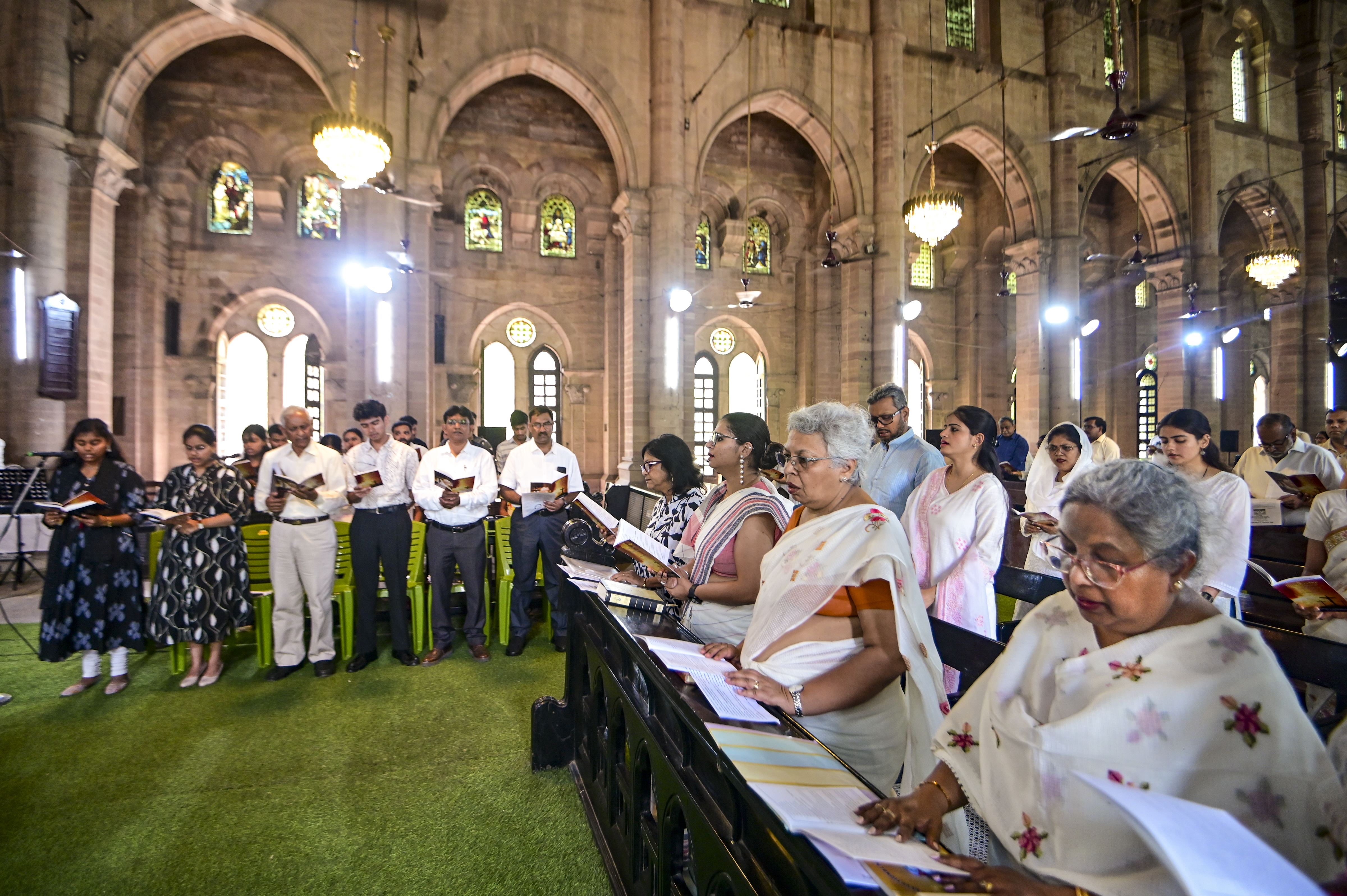 Prayagraj: People offer prayers during a Good Friday mass at All Saints Cathedral Church, also known as Patthar Girjaghar, in Prayagraj, Uttar Pradesh, Friday, April 18, 2025. (PTI Photo) (PTI04_18_2025_000163B)