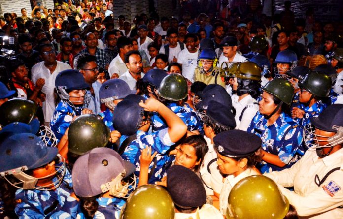“First, they take away our jobs by resorting to institutional corruption. Then they unleash their police force on us to spill our blood,” said Suman Biswas, another teacher whose shirt was all torn from the scuffle.