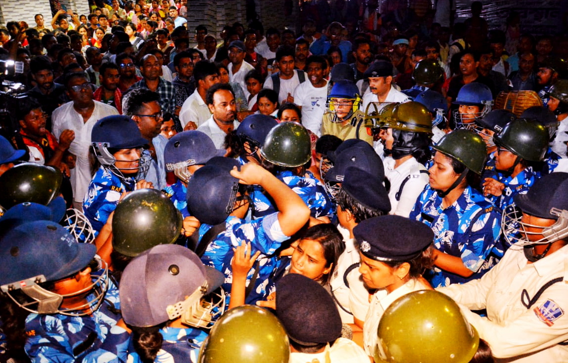 A significantly large police mobilisation, aided by Rapid Action Force (RAF) personnel, used force to disperse the protestors from inside the government building whose gates the teachers had breached in the afternoon to enter in large numbers and put up a blockade.