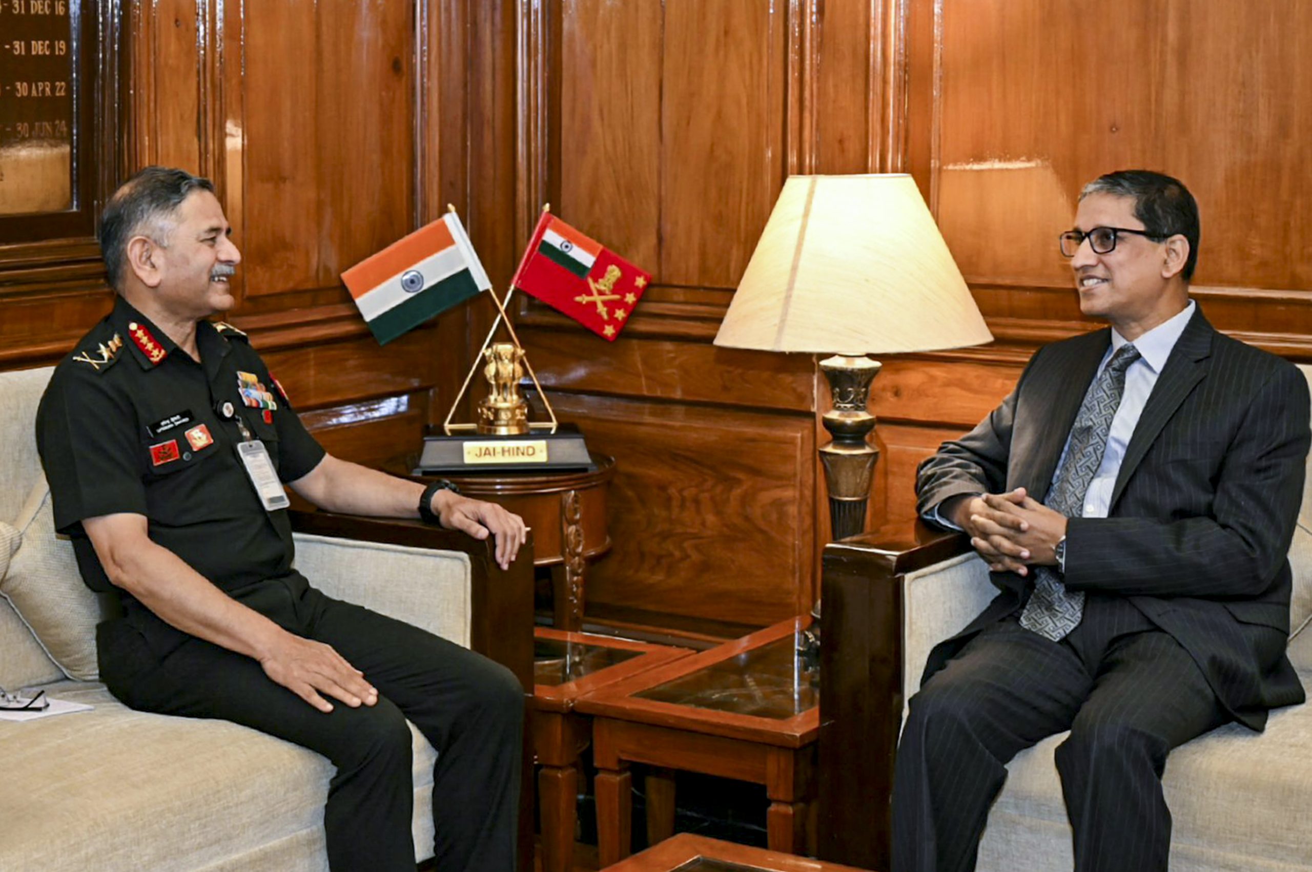 **EDS: THIRD PARTY IMAGE** In this image posted on April 2, 2026, Chief of the Army Staff (COAS) General Upendra Dwivedi in a meeting with High Commissioner of Bangladesh to India M Riaz Hamidullah, in New Delhi. (@adgpi/X via PTI Photo)(PTI04_02_2026_000241B)